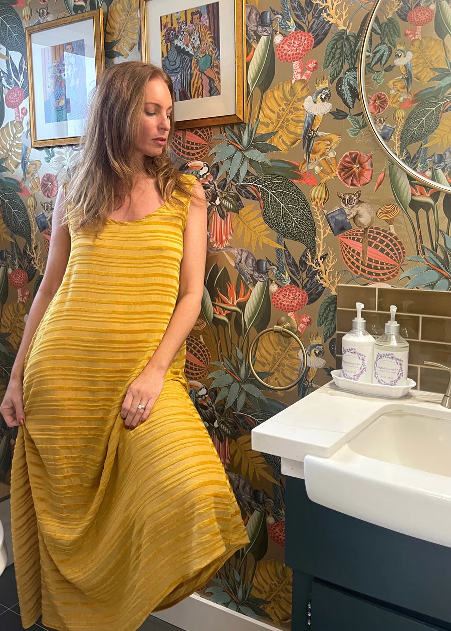 Our Lola is back in a sumptuously soft blend of silk and cotton, paired with velvet accents, in a warm Tuscan sun hue with subtle shaded stripes. Versatile for any occasion, whether it's lounging at home or dressing up for an outing. You can also style it with a belt for a more polished look at lunch or in the evening.